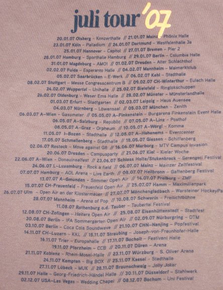 | 16:13, 22. Nov. 2007 | Juli Shirt Tour 07 Hinten.jpg (Datei) | 78 KB | Rovo | Mit freundlicher Genehmigung von Max Berger. | 1 | |