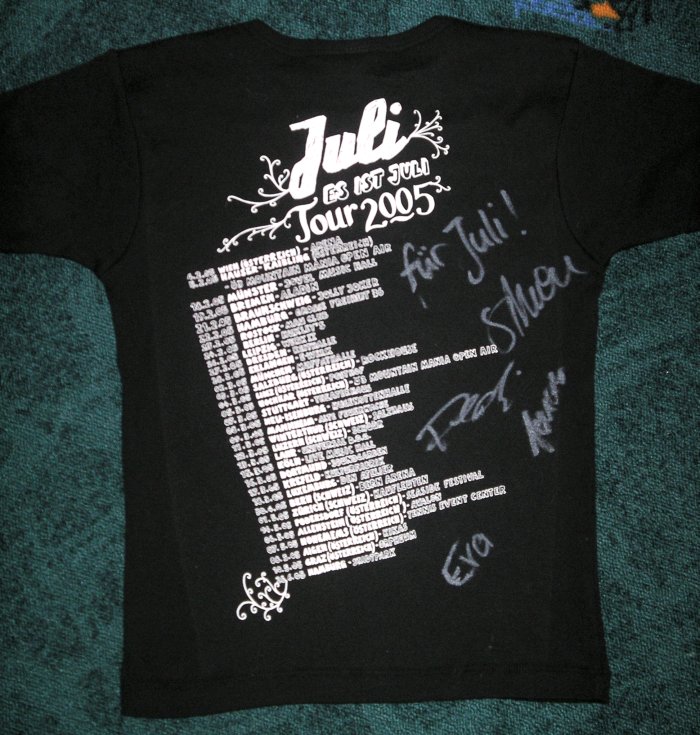 | 15:10, 21. Jun. 2008 | Juli shirt tour05 hinten.jpg (Datei) | 118 KB | Rovo | 1 | ||